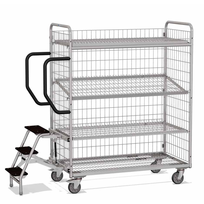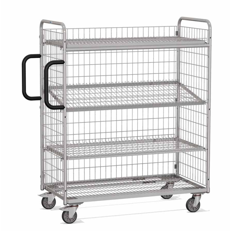 Unser Kommissionierwagen ist die Lösung für die Beförderung Ihrer Produkte und Pakete innerhalb Ihres Logistikbereichs. Seine haltbare Profilkonstruktion aus Stahlrohr verfügt über 2 Gitter und 4 Platten aus verzinktem Metallgeflecht, von denen 1 fix und 3 in den Gittern eingehängt werden und in 100 mm-Schritten höhenverstellbar sind.